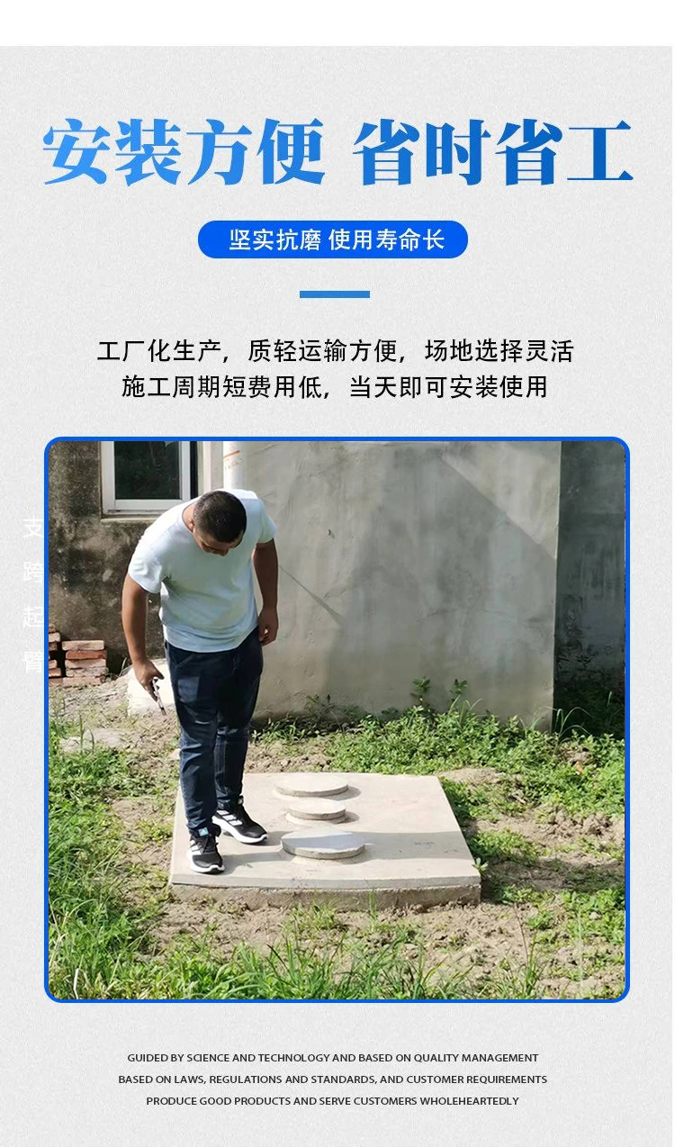 在优点方面,水泥化粪池具有结构简单、建造方便、成本低廉、使用寿命长等特点。特别是其选用环向聚集加强结构梁构造,具有很高的耐冲击抗压强度,且安装便捷,一般当日就能安装好并交付使用。同时,其气密性好,无缝隙、无渗漏,避免了传统化粪池因漏水而危害地表水和建筑的安全。