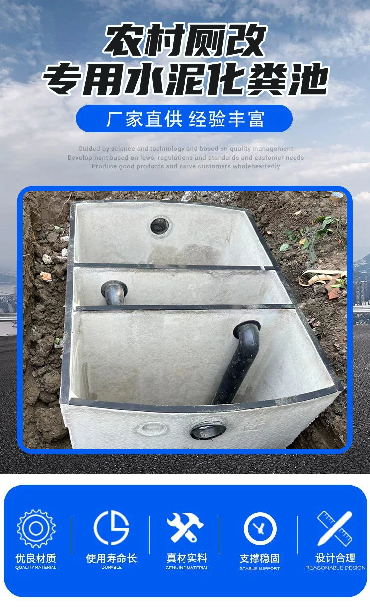 农村厕改专用水泥化粪池是一种用水泥建造的污水处理设备,主要用于农村地区的厕所改造,处理生活污水。其设计原理基于沉积和连续发酵,以清除生活污水中的悬浮物。